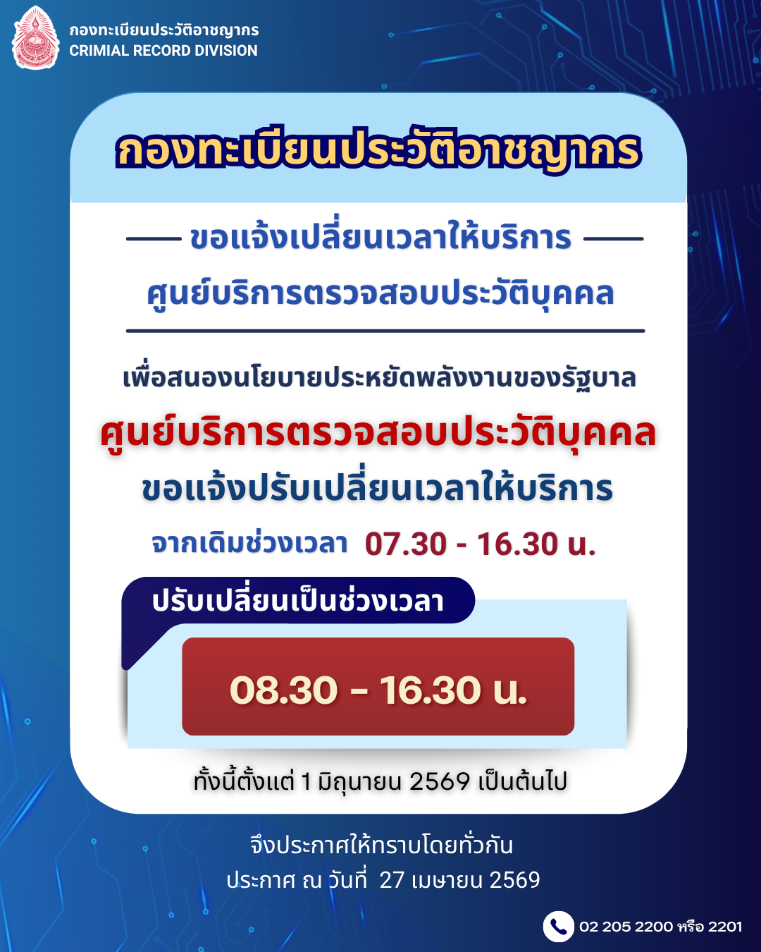 กองทะเบียนประวัติอาชญากร ขอแจ้งเปลี่ยนแปลงเวลาให้บริการของศูนย์บริการตรวจสอบประวัติบุคคล
